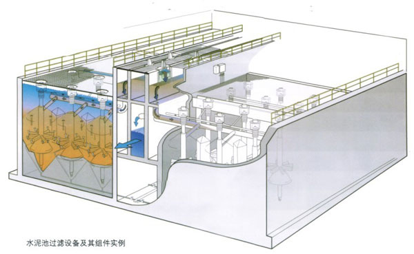 這種類型的過濾器安裝時(shí),所有過濾單元(每個(gè)單元由多個(gè)過濾組件組成)公用一個(gè)砂床。一套設(shè)備實(shí)質(zhì)上沒有過濾面積限制,因此活性砂過濾器可以應(yīng)用在處理相當(dāng)于10萬或更多人口用水的大型水廠和污水處理廠。